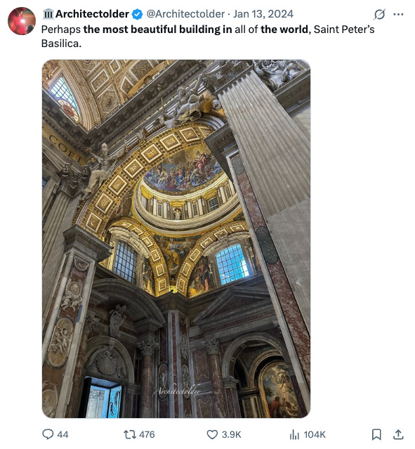 You know those posts on X that ask or state, “What’s the most beautiful building in the world?” The replies are always the same: a cathedral in Florence, St. Peter’s Basilica, some baroque palace in France, the Taj Mahal in India. Then come the contrarians who post Soviet apartment blocks and say this is beauty, mocking the very notion.
