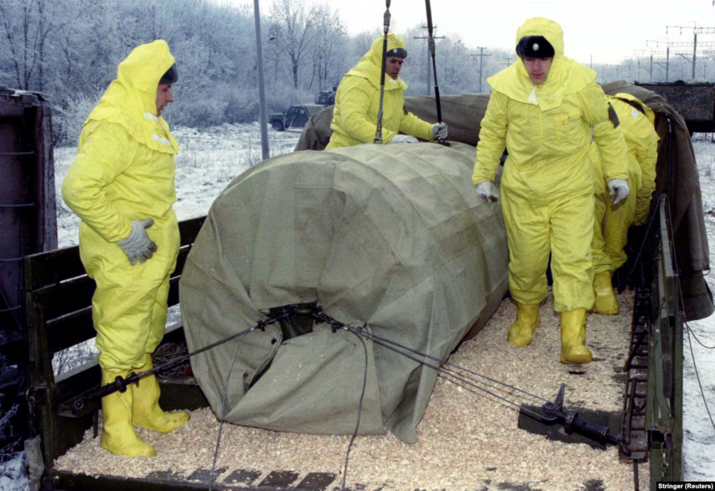 A nuclear warhead is loaded from a railway car onto a truck during training exercises for specialized personnel on how to respond to possible accidents during the transport of nuclear materials. Near Kirovograd. December 1995.