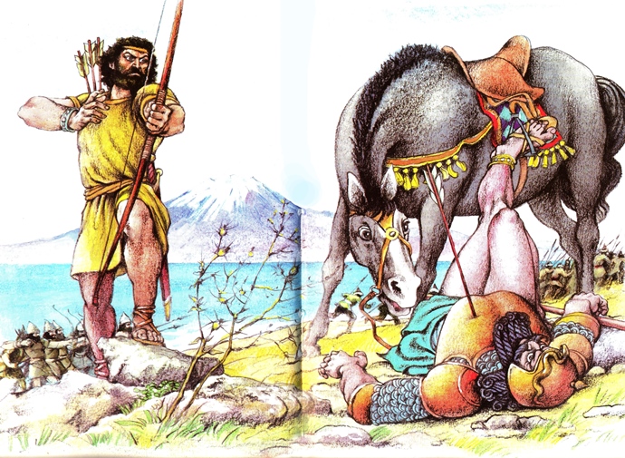 The conflict between Hayk and Bel is regarded by the historian Movses Khorenatsi, who lived in the fifth century, as the pivotal moment in Armenian history. Hayk, a giant with curly hair and “mighty arms”, resided in Babylon during the time of the Tower of Babel. Hayk became the main voice of opposition when the titan Bel (Nimrod) came to power and demanded complete, godlike devotion from all peoples. He assembled his household of 300 men and their families and moved north to the Armenian Highlands, refusing to acknowledge the tyrant’s authority. This act of secession exchanged the pleasures of an empire for the “rugged and cold” independence of a new settlement near Ararat.